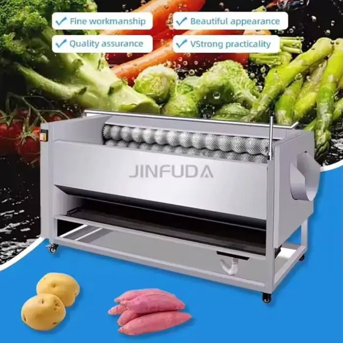 The machine features automatic operation that allows users to easily load vegetables or fruits and let the machine handle the washing and peeling process with minimal manual intervention.