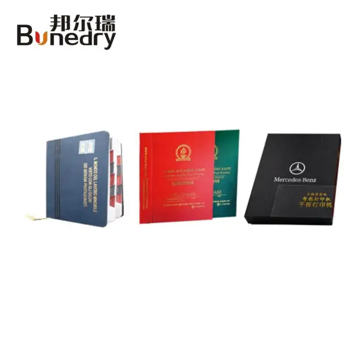 Applications include creating custom notebooks, designing elegant gift boxes, personalizing wine boxes, making unique promotional items, and producing high-quality labels and stickers.