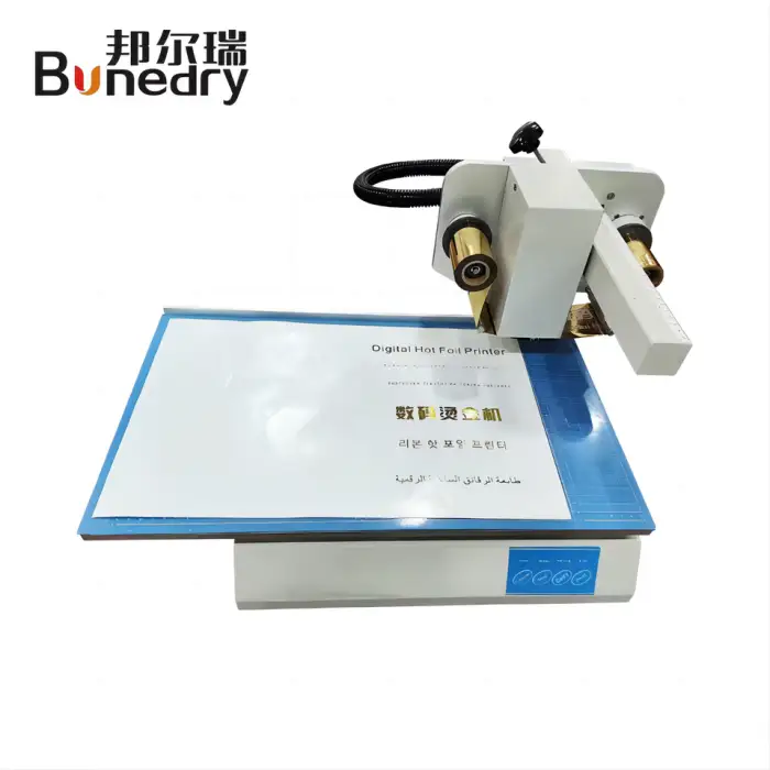 The Manual Foil Stamping Machine 8025 can print on various materials including acrylic, paper, PVC, and leather.