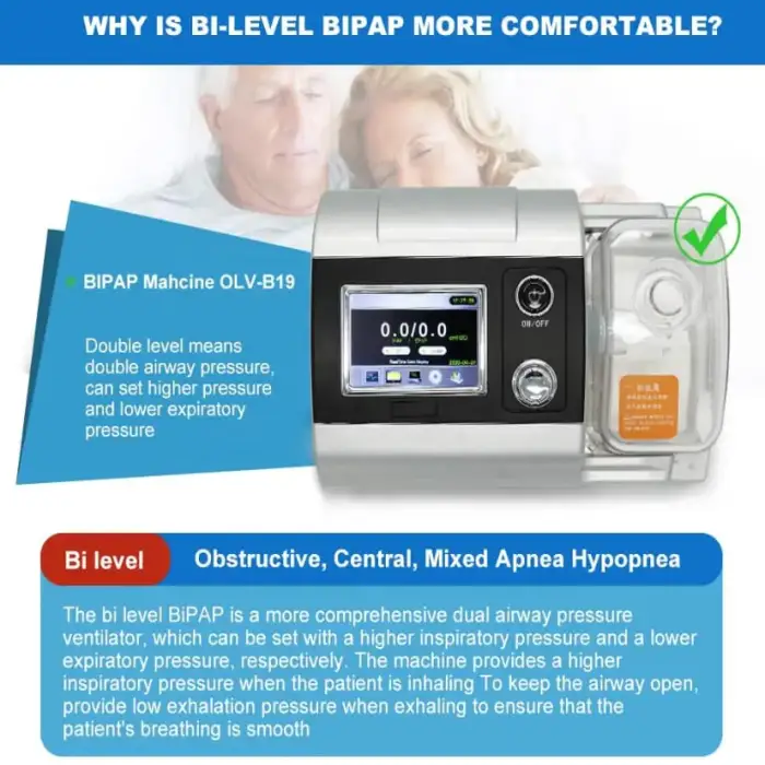 The BIPAP Machine OLV-B19 is designed to assist patients with respiratory issues, providing effective therapy for conditions like sleep apnea.