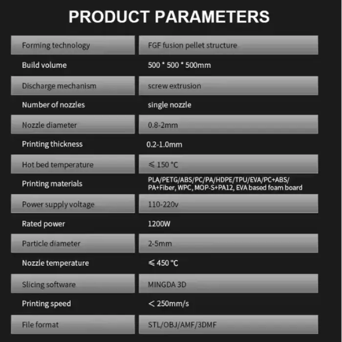 This printer is compatible with a wide range of materials including PLA, PETG, ABS, metal, ceramic composites, and other pellet-based materials.