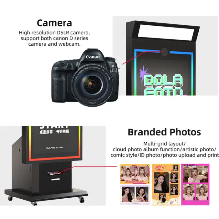 The DOLA Mirror Photo Booth is a portable and digital photo booth that features a sleek design and a touch screen, allowing guests to take selfies and print photos instantly.