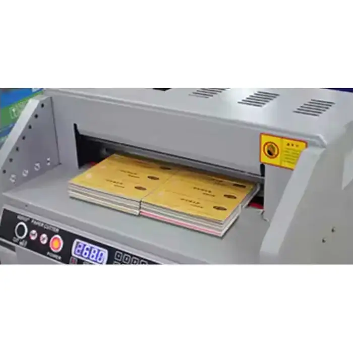 This electric guillotine offers faster cutting speeds, higher precision, and less manual effort compared to traditional manual paper cutters.
