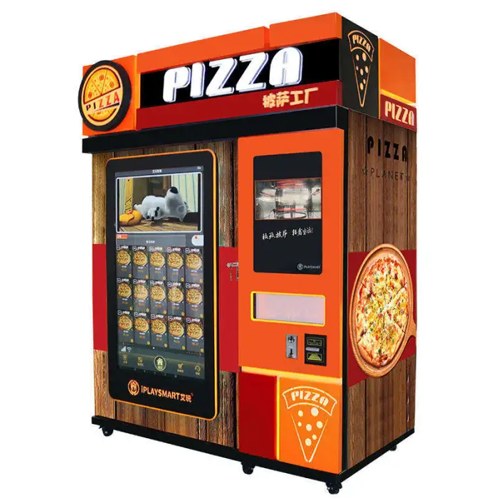 The machine is designed to serve hot, fresh pizza quickly, typically within a few minutes after the order is placed.