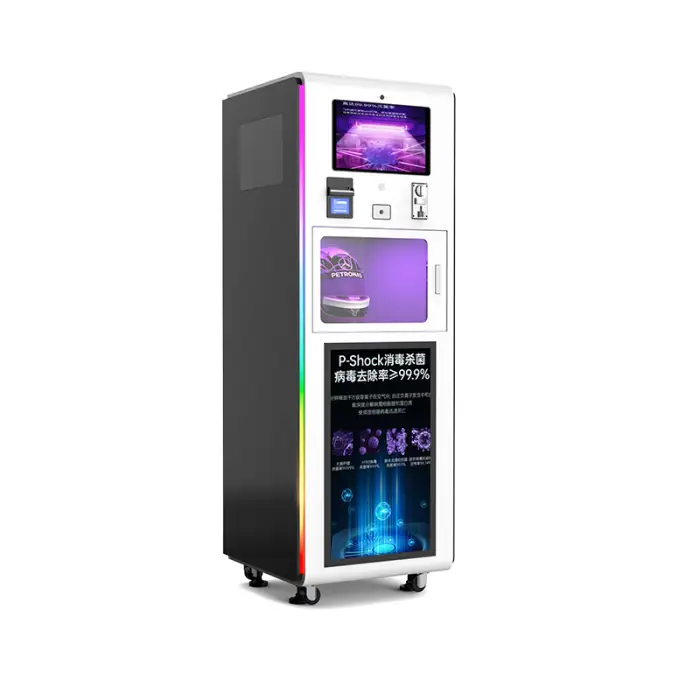 The machine utilizes an efficient cleaning and deodorizing system that automatically cleans helmets with minimal user intervention, ensuring effective hygiene.