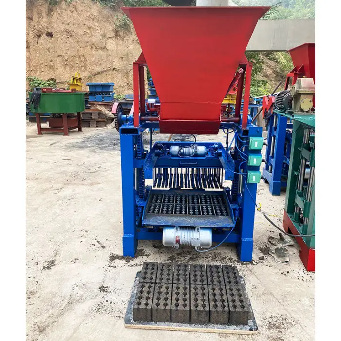 The machine can produce various types of bricks, including hollow bricks, paving stones, interlocking bricks, and curbstones.