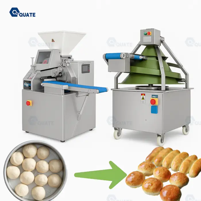 This machine uses a conical rounding system to shape the dough into uniform balls.