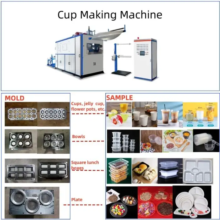 This machine is compatible with various types of thermoplastic materials, including PET, PS, and PP, which are commonly used for manufacturing plastic cups.