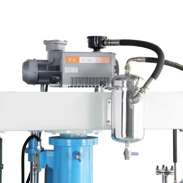 The vacuum system removes trapped air and volatile gases during mixing, improving degassing, reducing foam and entrapped bubbles, and producing more stable, higher-quality dispersions.