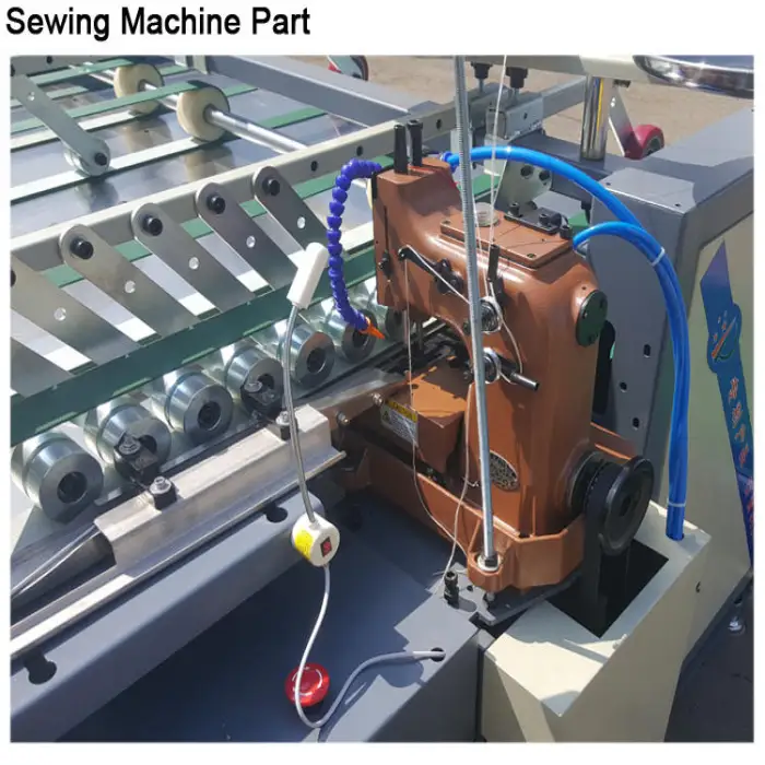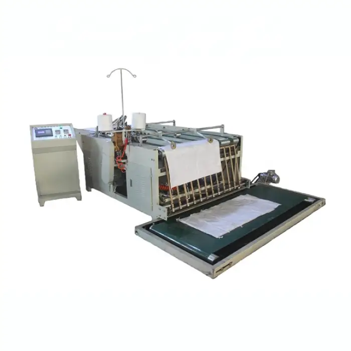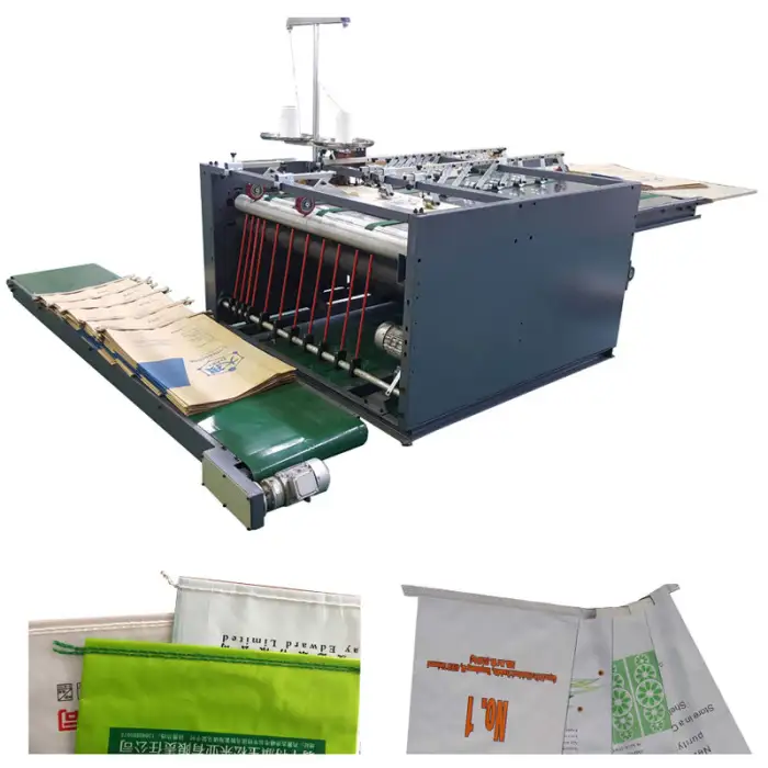 The machine is designed for manufacturing woven plastic bags, specifically sewing the bottoms for secure closures.
