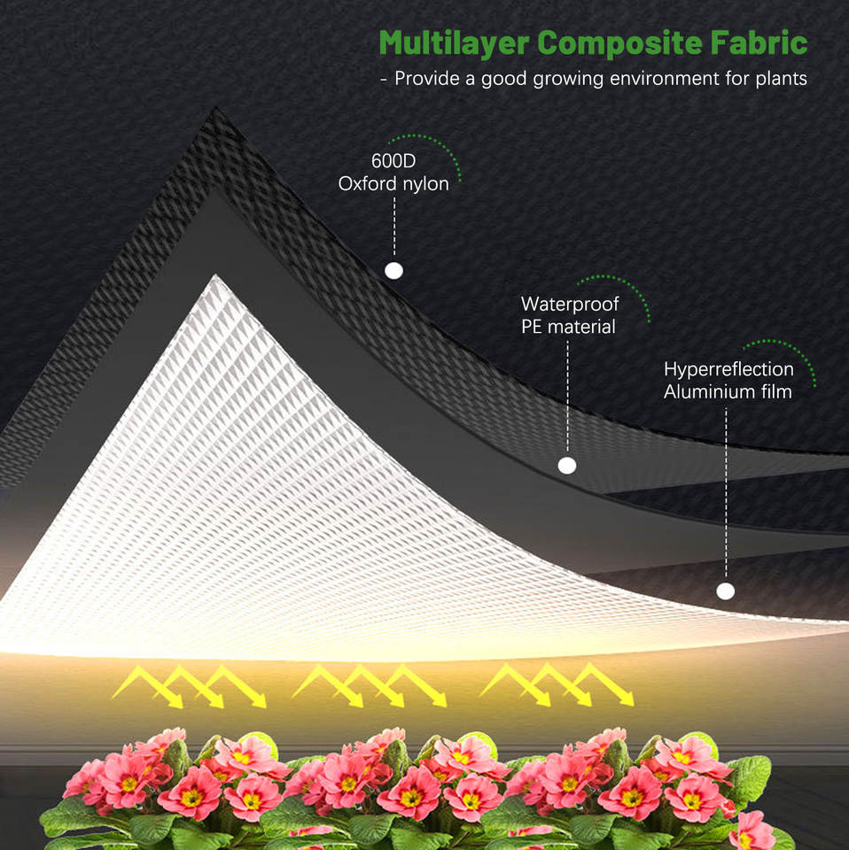 The high reflective silver polyester film inside the tent maximizes light distribution, ensuring that your plants receive even illumination for optimal growth.