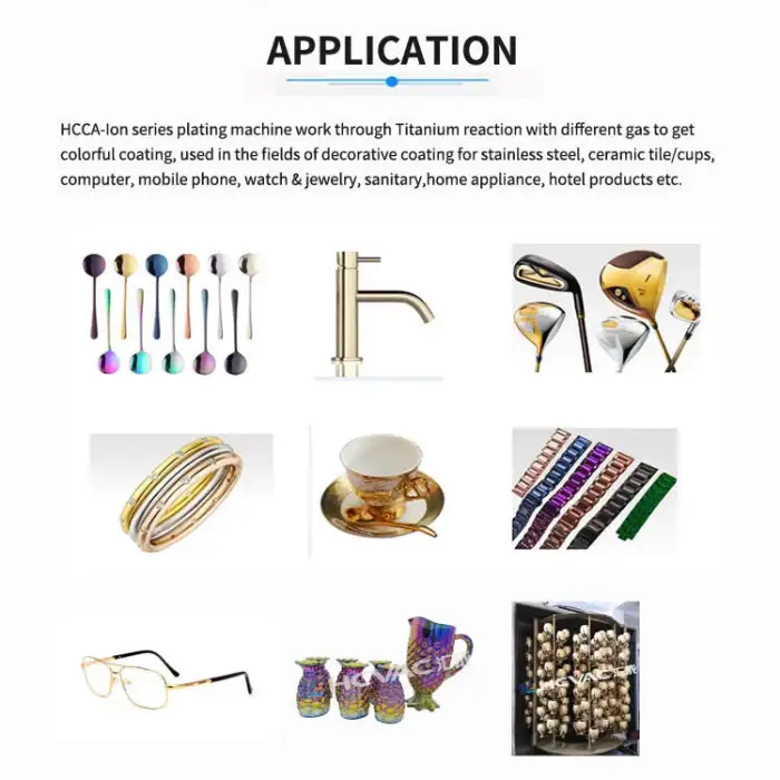 The machine is well-suited for coating metal furniture, glass surfaces, automotive parts, electronic components, and jewelry.