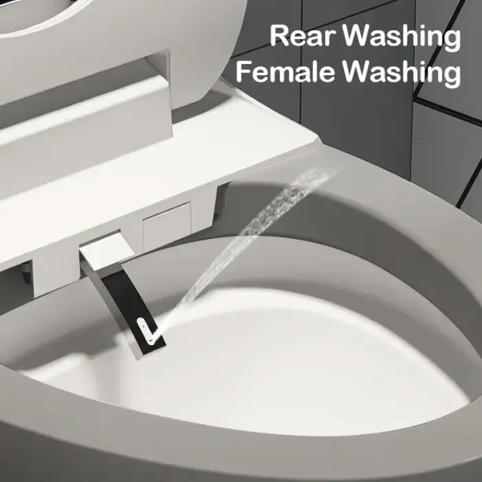 The Q8 Intelligent Smart Toilet includes features such as air-drying, heated seat, nozzle self-cleaning, female washing, and buttocks washing. It also has a siphon jet flushing system that uses 3.0-4.5L of water per flush.