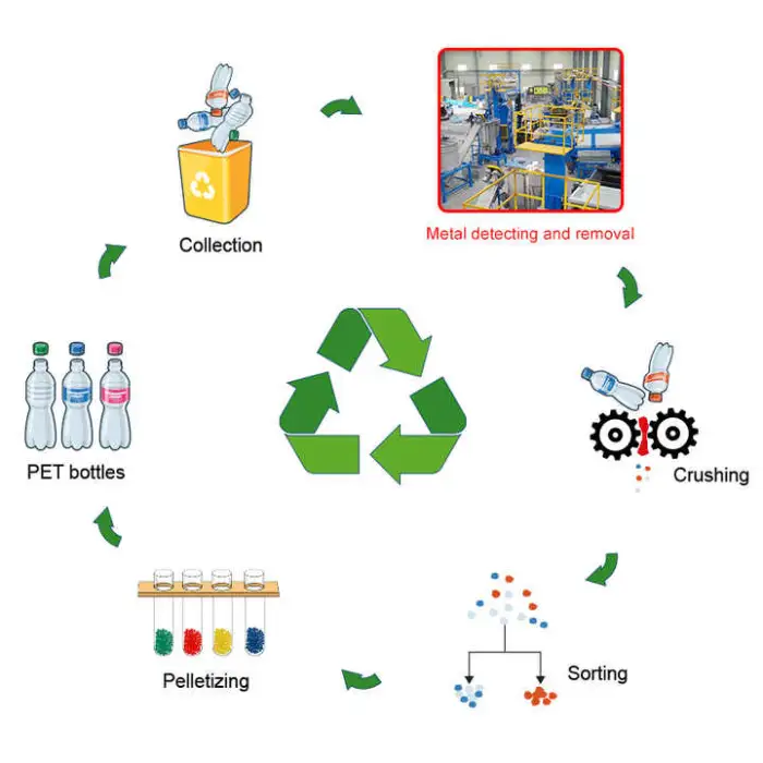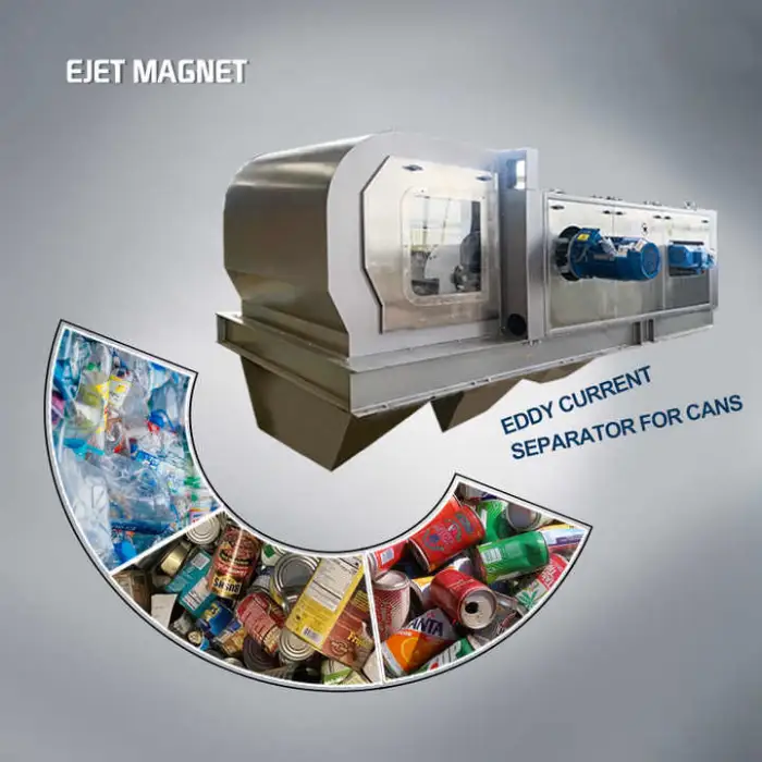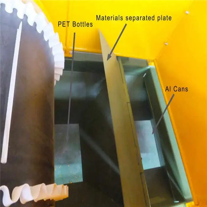 The machine's adjustable parameters include belt speed and vibratory feeder settings to accommodate different recycling needs.