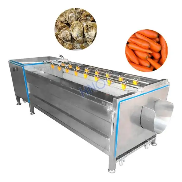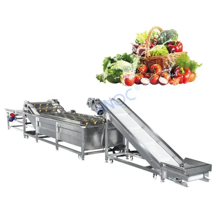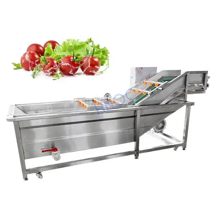 The machine utilizes air bubble spray washing and brush roller washing technologies for effective cleaning of fruits and vegetables.