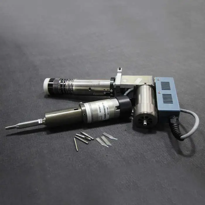 The machine is equipped with a vibrating knife cutting tool, punching tool, and drawing tool.