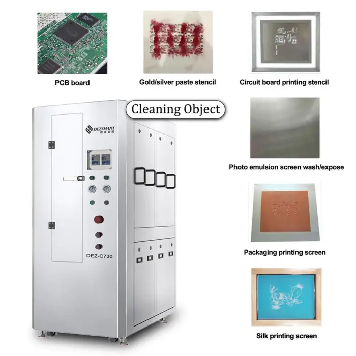 The machine is ideal for screen printing businesses, electronic manufacturing, PCB assembly processes, and any operation requiring stencil cleaning.