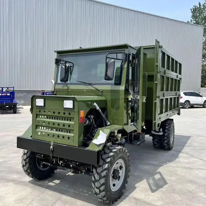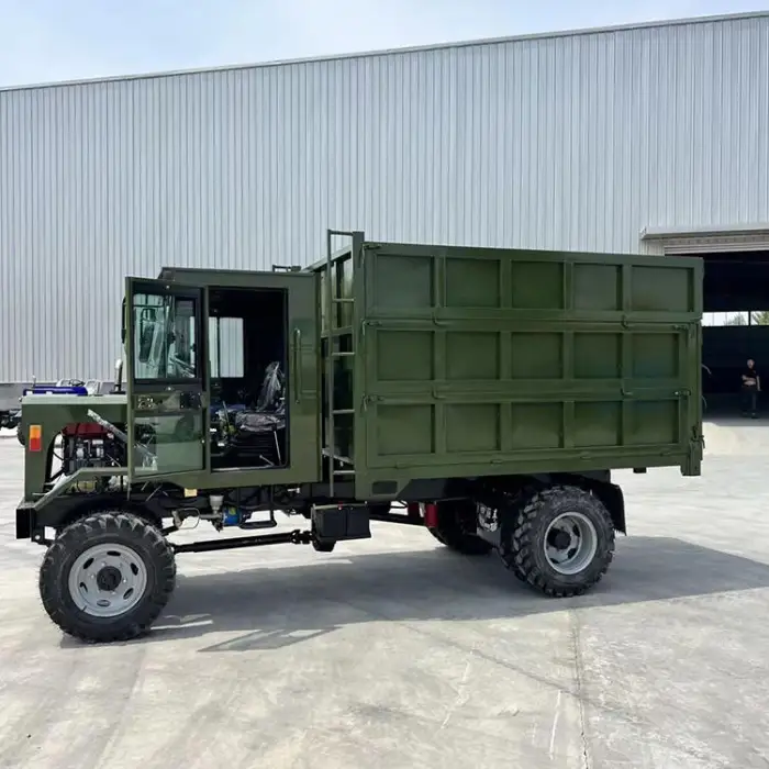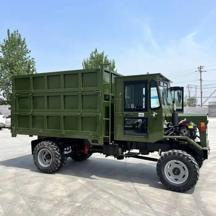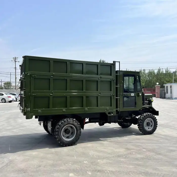 The four-wheel drive system enhances traction and stability, allowing the dump truck to navigate challenging terrains effectively.