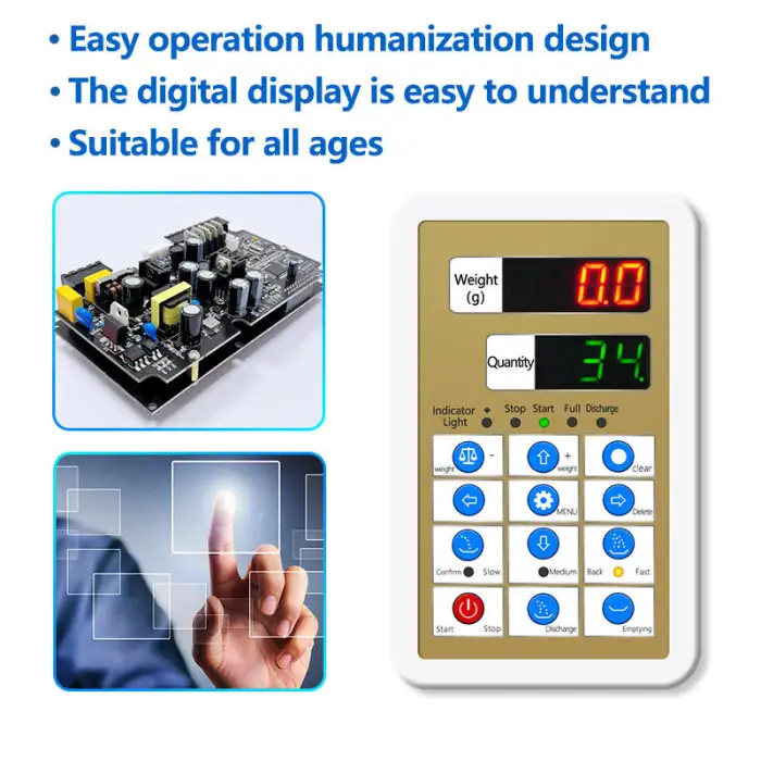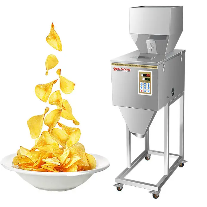 The filling machine can handle a variety of products, including nuts, fries, food products, chemicals, commodities, hardware, machinery, and even cigarette packaging.