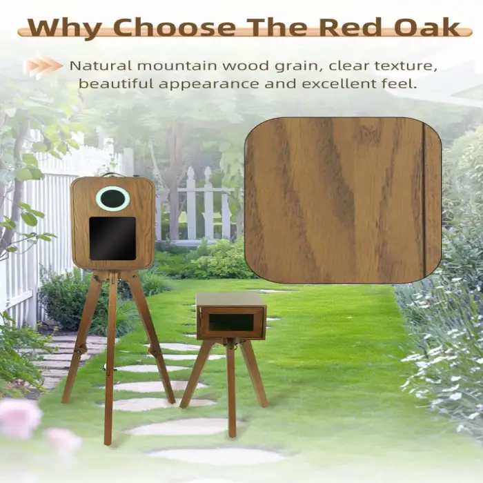 The photo booth is made from real wood, specifically Red Oak, which adds elegance and durability.