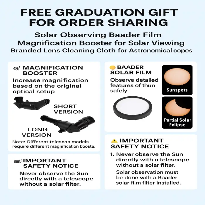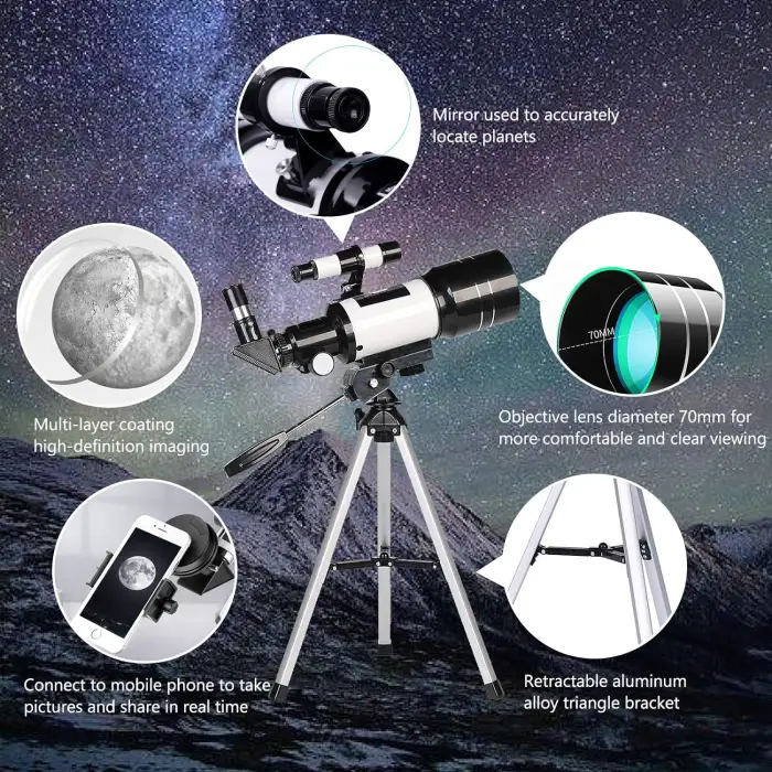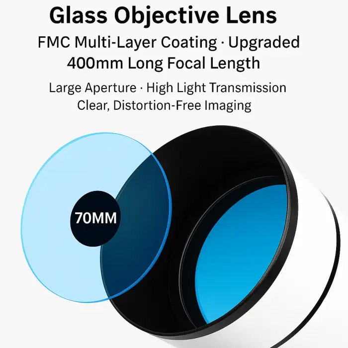 The telescope features a 70mm glass objective lens with a FMC multi-layer coating for bright and clear images.