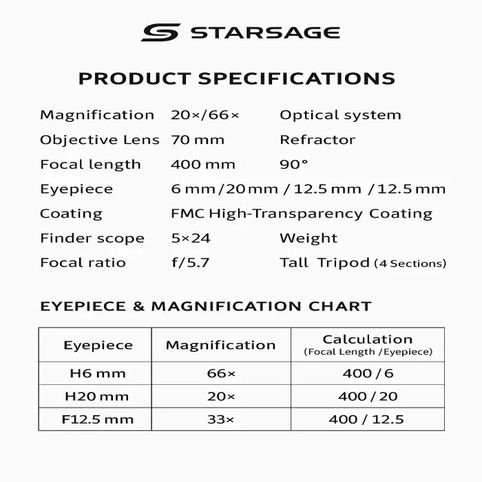 The StarSage telescope offers three magnification options: 20x, 33x, and 66x.