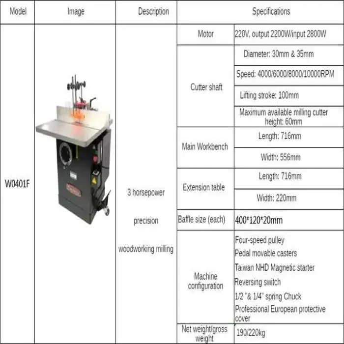 The STR 0401F Wood Shaper has a power output of 2.2 kW.
