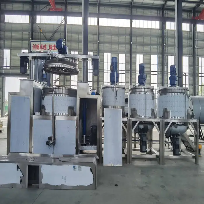 The machine employs a high shear homogenizer along with an upper disperser to achieve thorough mixing and emulsification of ingredients.