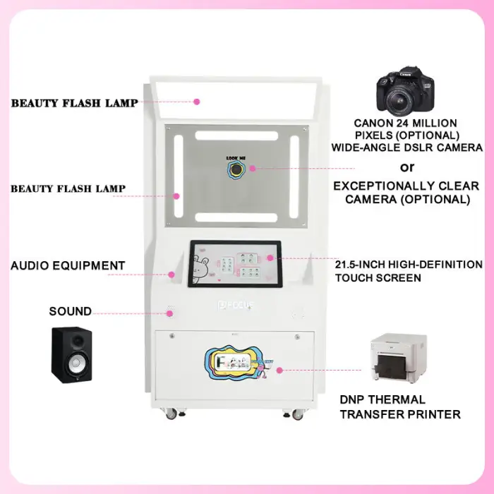 The photo booth is made from luxury hardware case, acrylic, and mirror glass, ensuring a stylish and durable design.