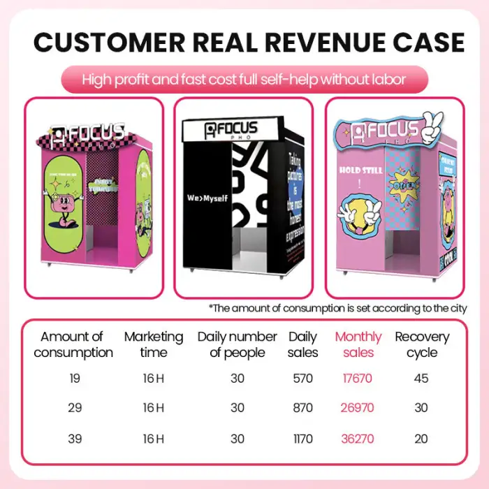 The photo booth accepts payments via coin machine, note machine, and credit card.