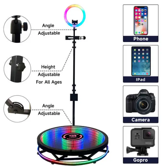 The 360 Photo Booth is compatible with smartphones, cameras, SLRs, and iPads.
