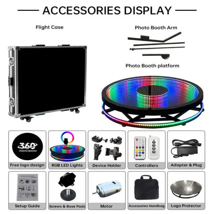 The Video Camera 360 Photobooth is made from sturdy metal, tempered glass, and LED components.