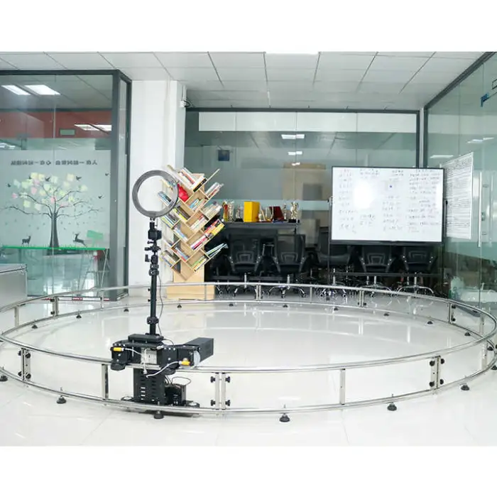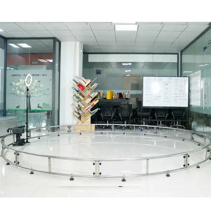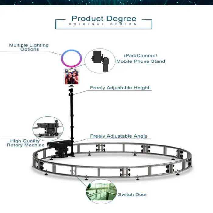 The booth utilizes a smart motor to rotate around the subject, capturing a full 360-degree view and creating dynamic videos and photos that can be shared immediately.