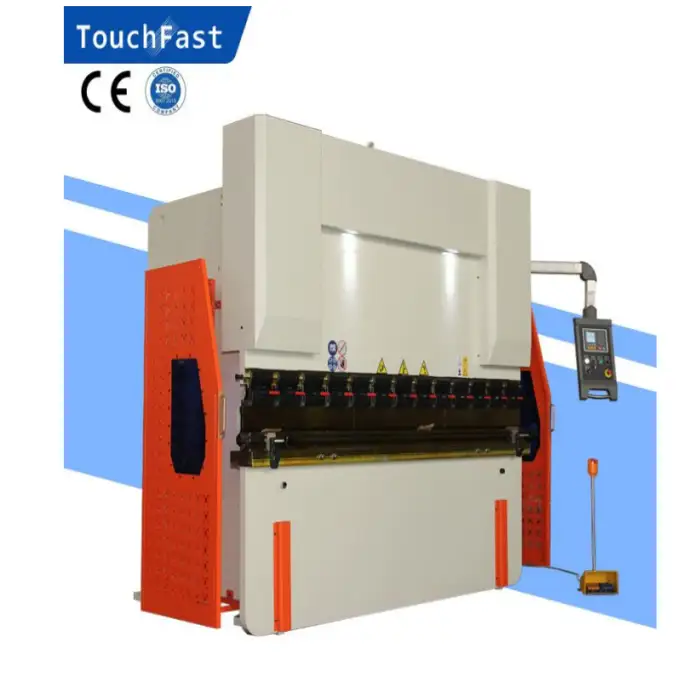 This press brake includes features such as emergency stop buttons, safety guards, and overload protection to ensure operator safety.