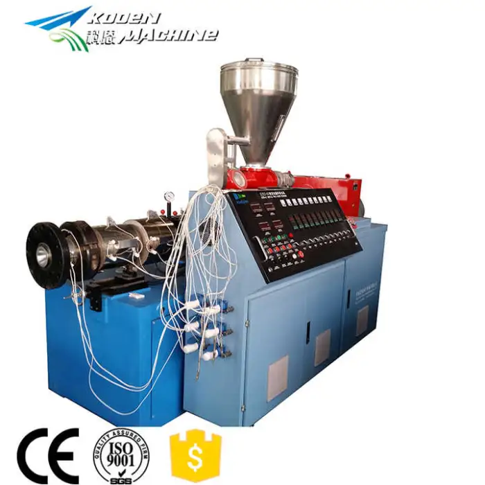 The machine can process various materials including PE, PP, PVC, and wood-plastic.