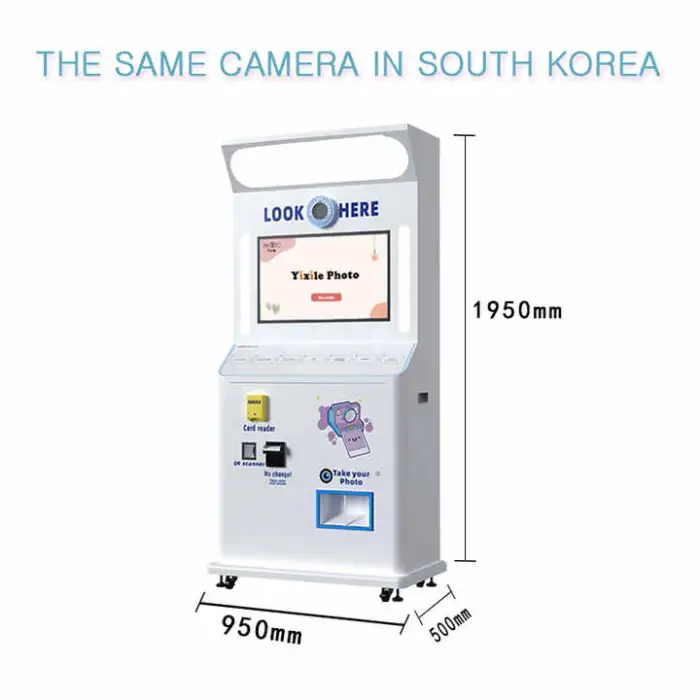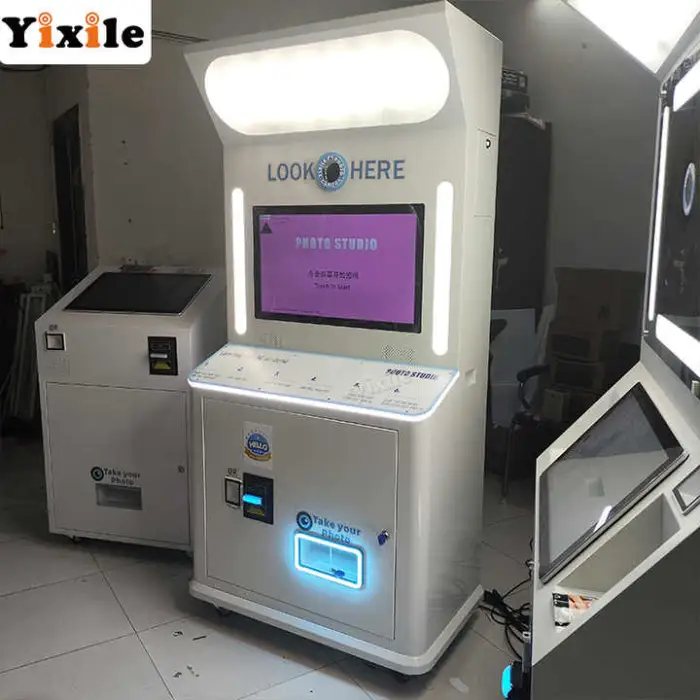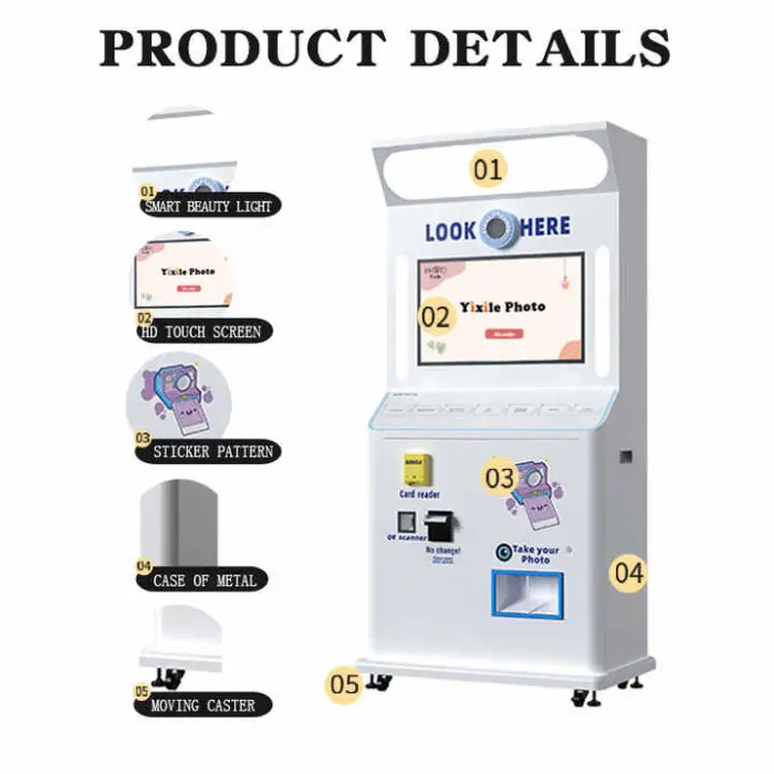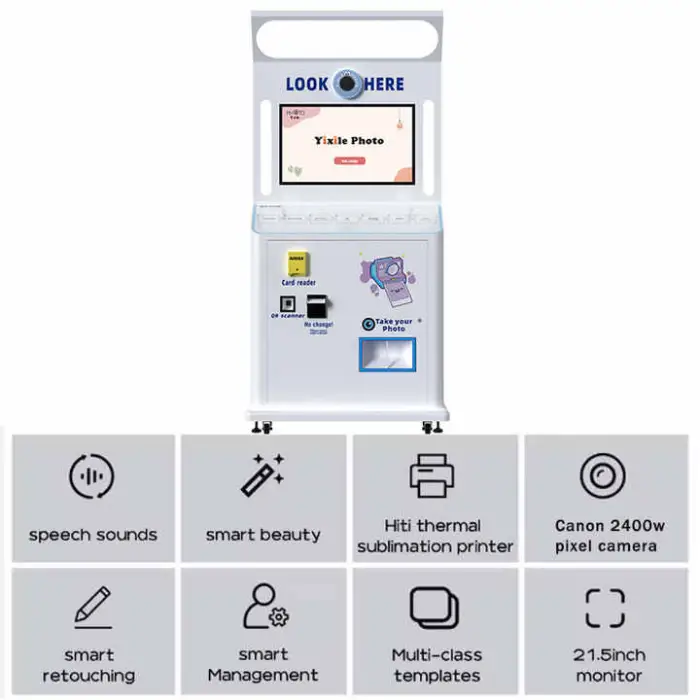 A freestanding, interactive photo booth that uses a 27-inch touch screen and an optional Canon DSLR to capture photos and print custom sticker-style photos on-site for events, malls, schools and commercial spaces.
