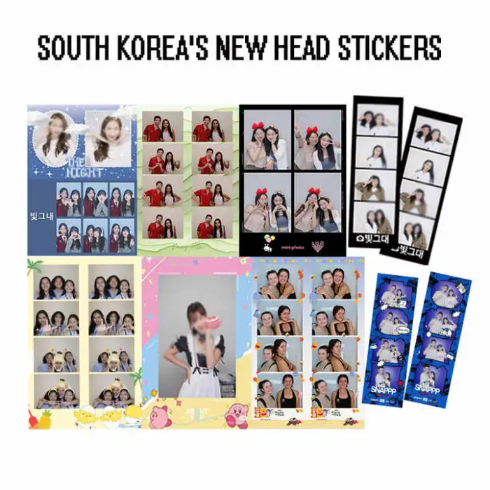 The machine prints photos as custom stickers using an integrated sticker/photoprinter. Templates and graphics can be added or customized so guests receive branded or themed sticker prints immediately after their session.