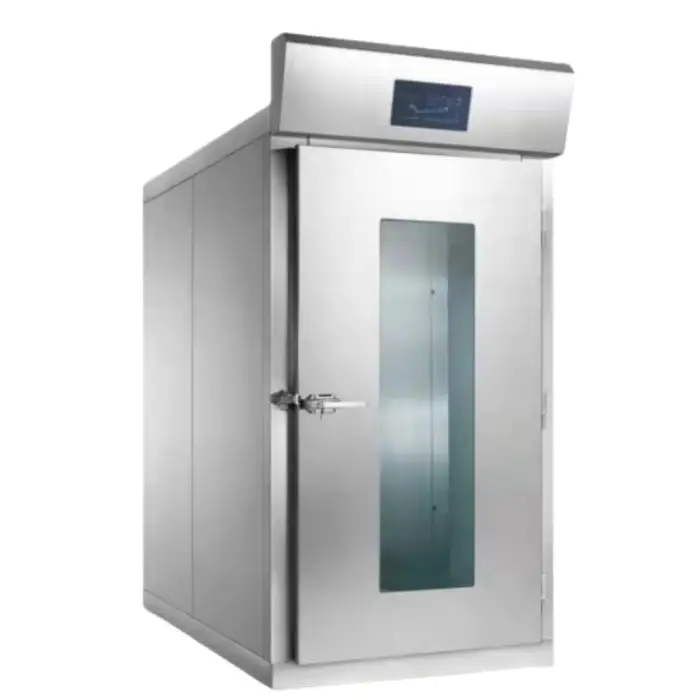 The fermentation room can hold 4 trolleys with a total capacity of 128 trays, supporting ambient temperatures up to 50°C and humidity levels up to 99% RH.