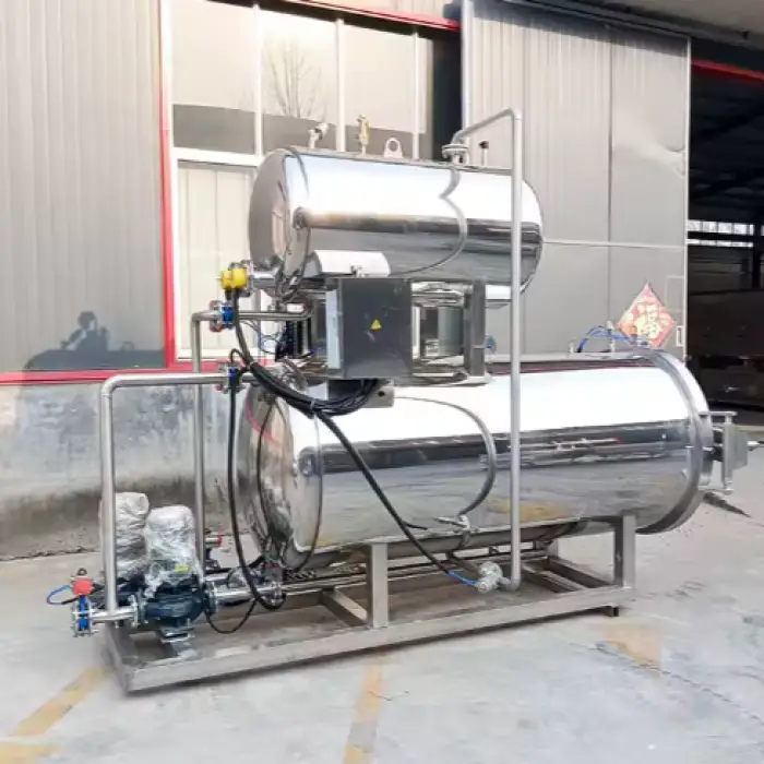 Sterilization is performed using a water-bath process with high-pressure steam supplied by a steam boiler. The combination ensures uniform heat transfer and effective sterilization.