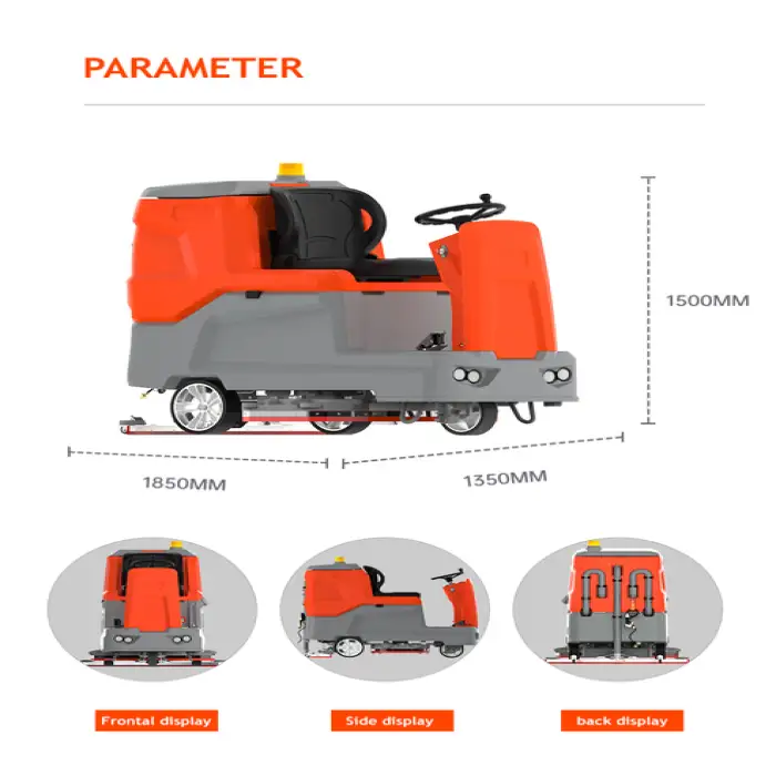 The 13 Inches Brush Ride on Floor Scrubber is designed for heavy-duty cleaning of large indoor areas such as workshops, warehouses, retail stores, parking garages, schools, and hospitals. It performs wet scrubbing with cold water and cleaning solution.