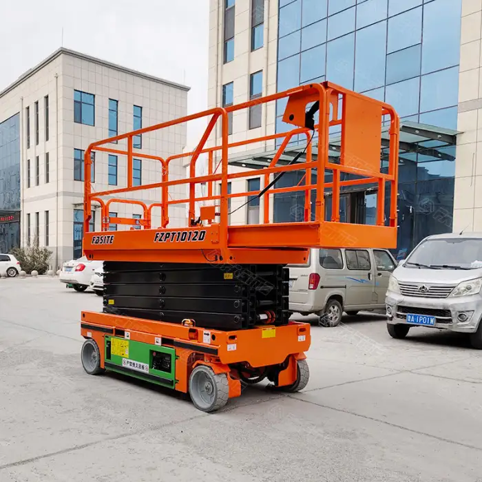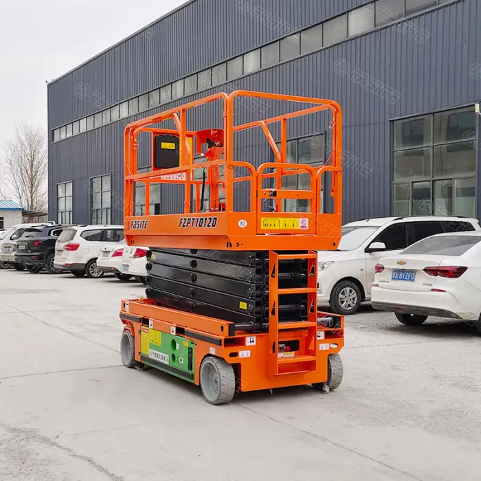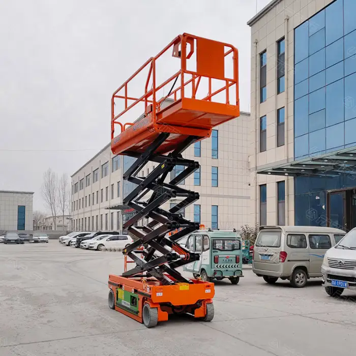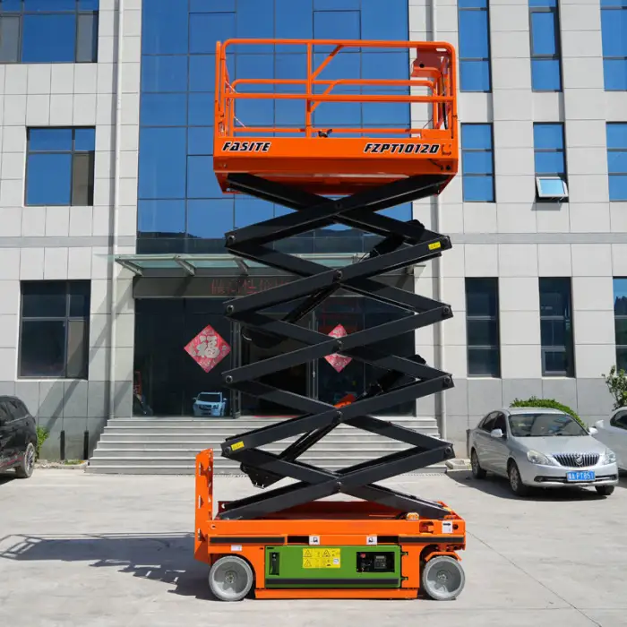 The 14m Electric Scissors Lift can reach a maximum height of 10 meters.