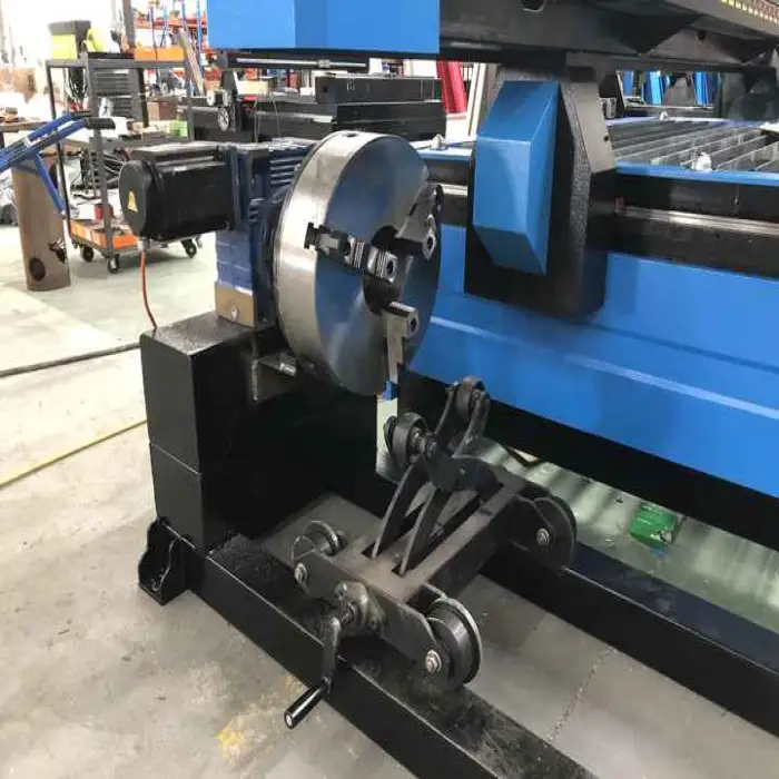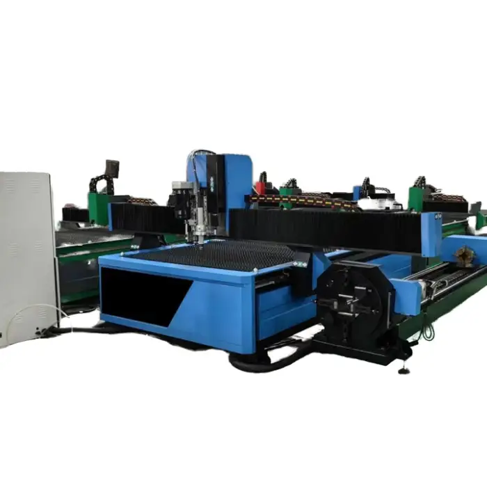 The machine is built for plate cutting and can be configured for tube/pipe cutting when equipped with an optional rotary device or specialized fixtures. Ask the supplier about the available rotary attachments and any setup required.