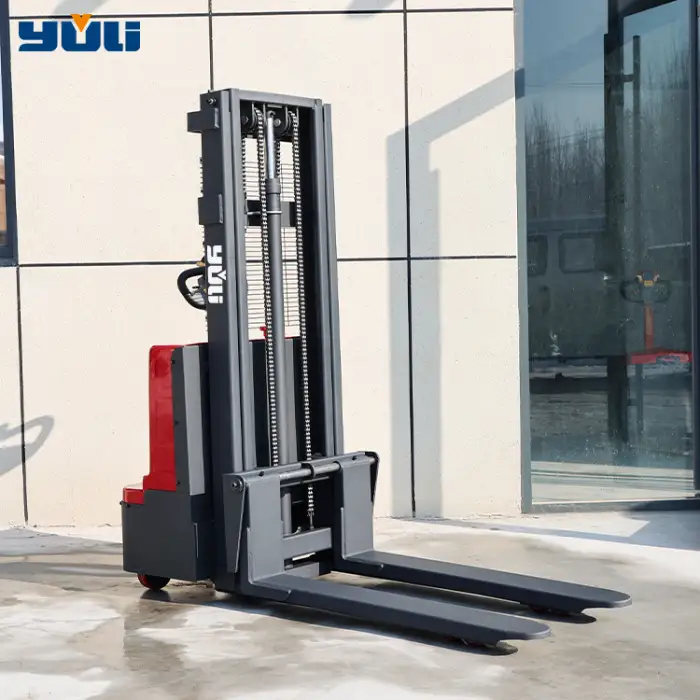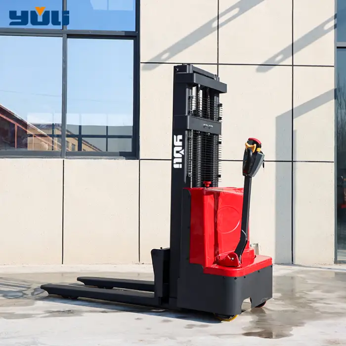 This electric stacker operates in a walking style, allowing the operator to walk alongside the vehicle while controlling its movement.