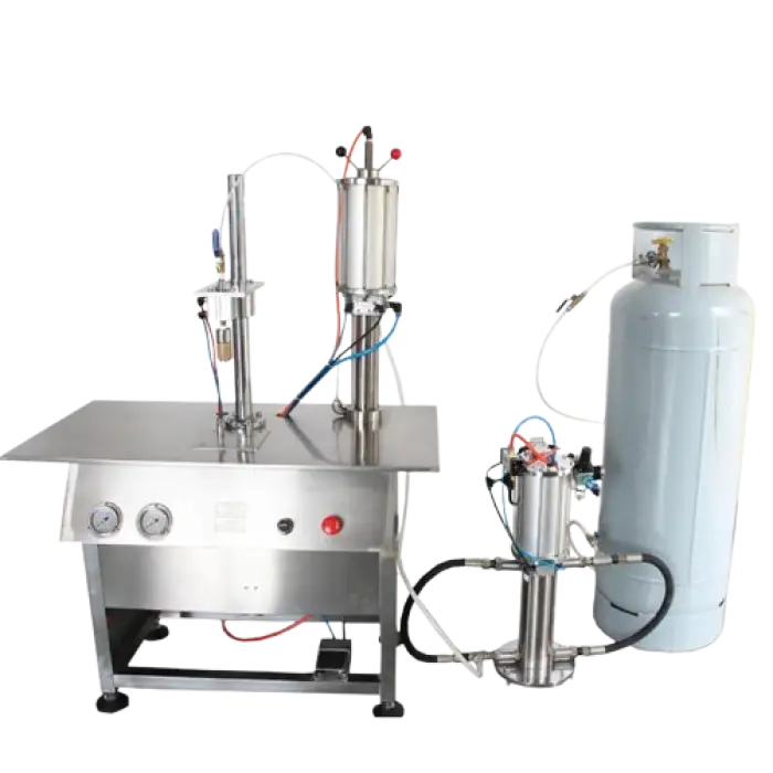 The 1600B Aerosol Filling Machine uses a pneumatic drive for effective operation.