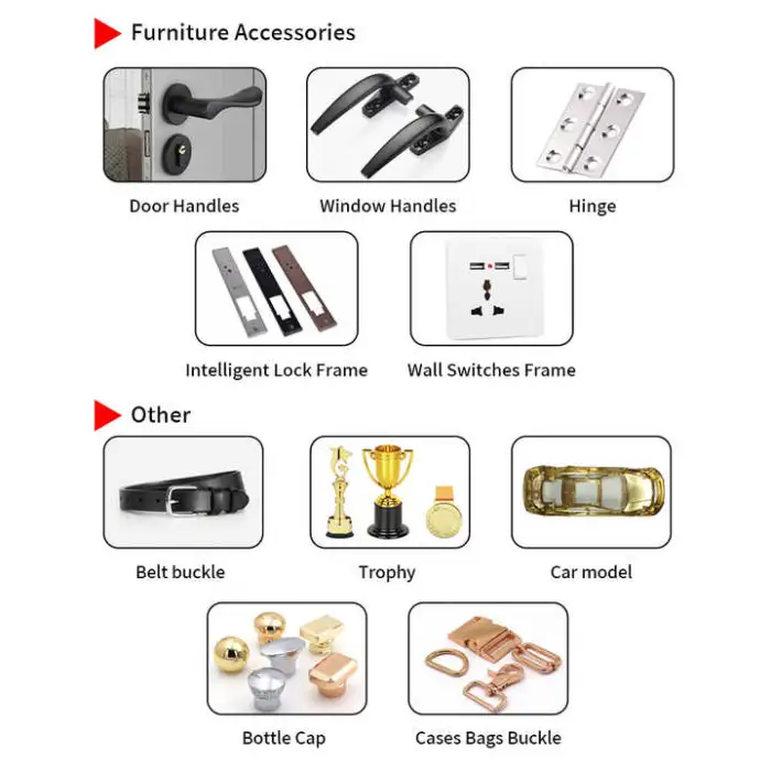 Typical applications include motorcycle and car accessories, household appliance casings, handles and other intricate metal parts, medals and decorative items.