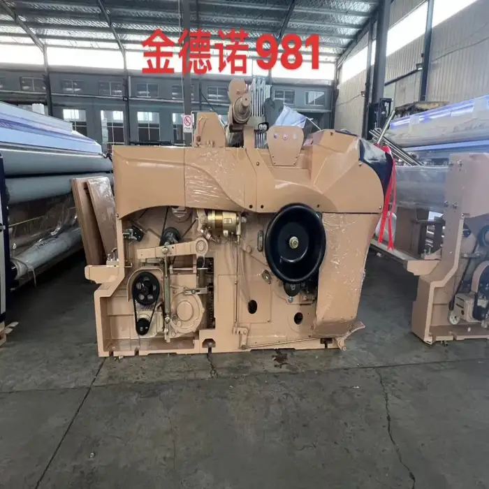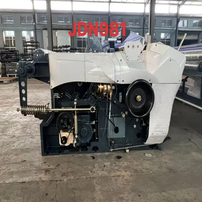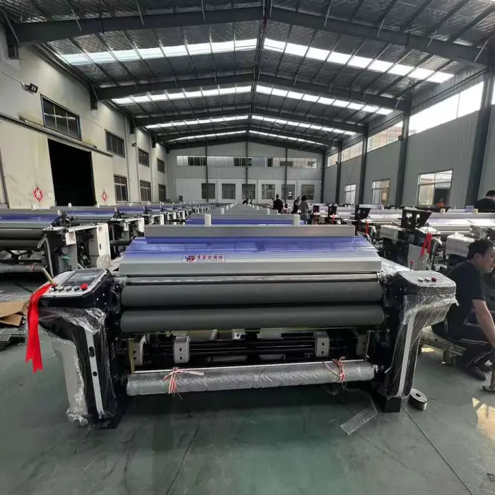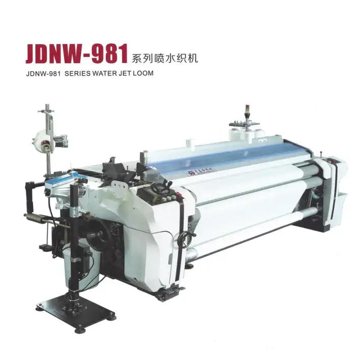 This machine supports various weaving materials, including 100% polyester and other synthetic fibers, making it versatile for different textile production needs.