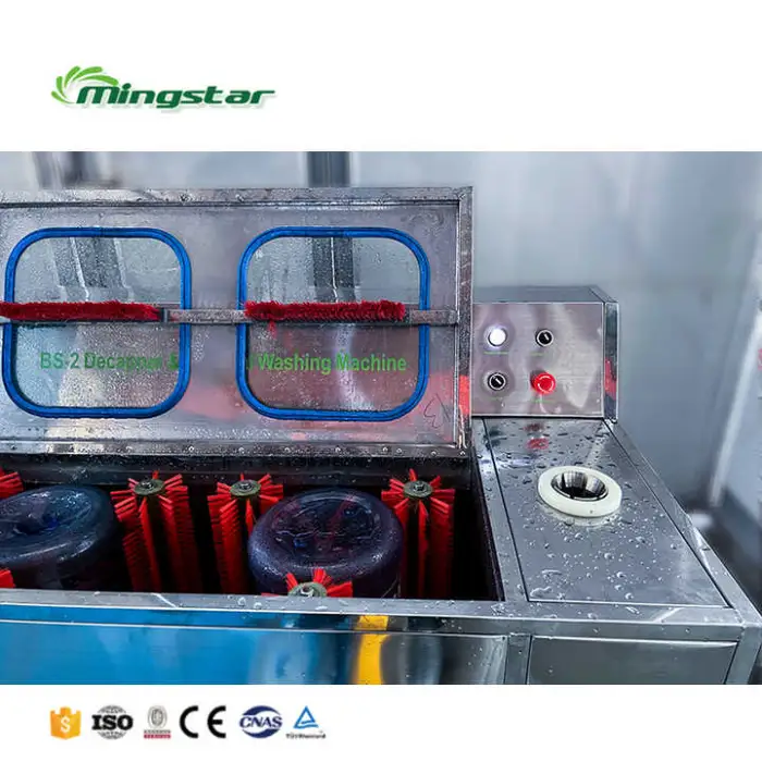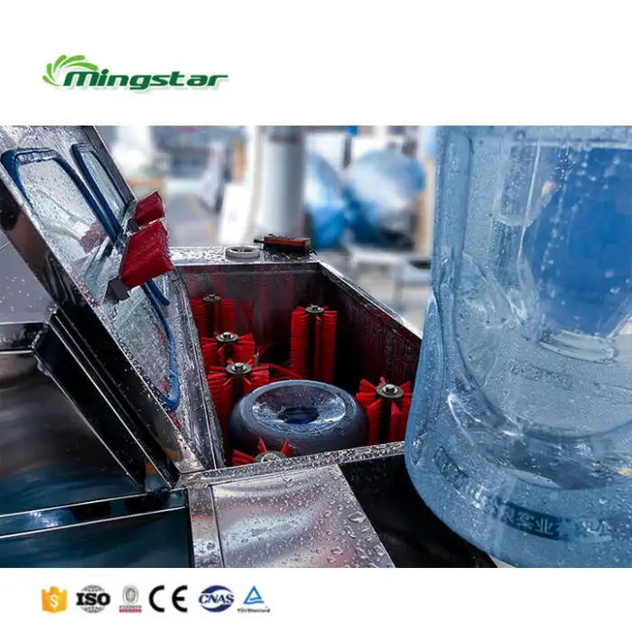 The machine is designed specifically to clean 19–20L (5-gallon) water bottles and large water buckets commonly used in water dispensing and bottling applications.