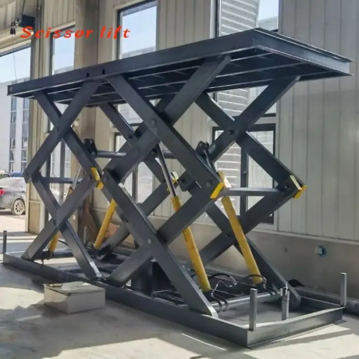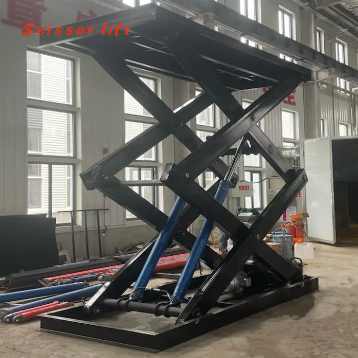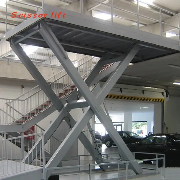 The lift operates using an electro-hydraulic driving system, providing reliable and efficient lifting performance.