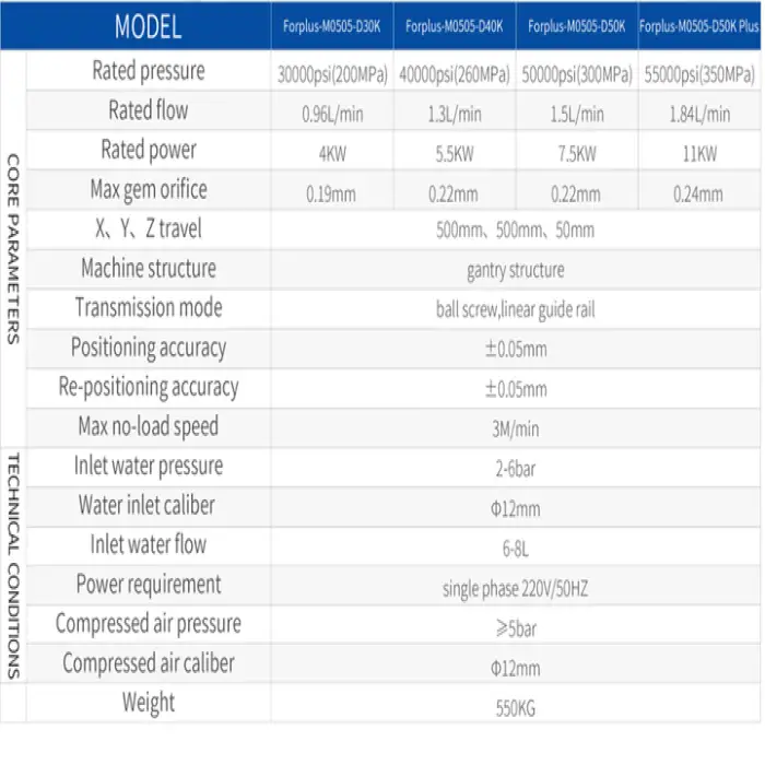 The machine operates at a high pressure of 50,000 psi, allowing for precision cutting of various materials.