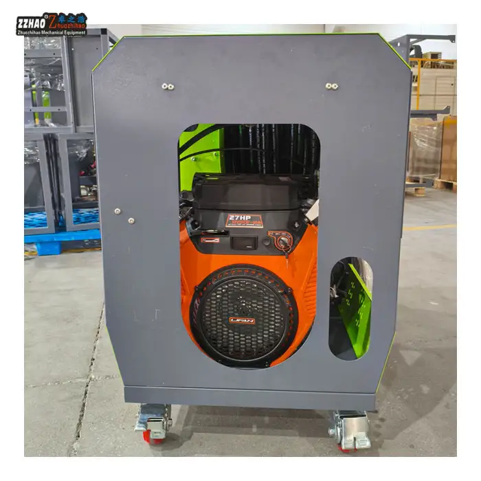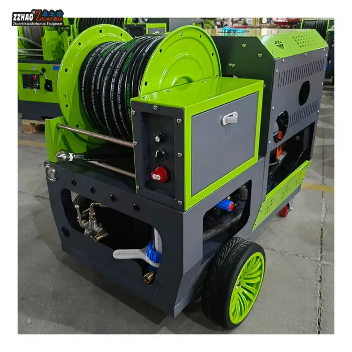 The machine uses powerful high-pressure water jets to effectively remove blockages and debris from underground pipelines.